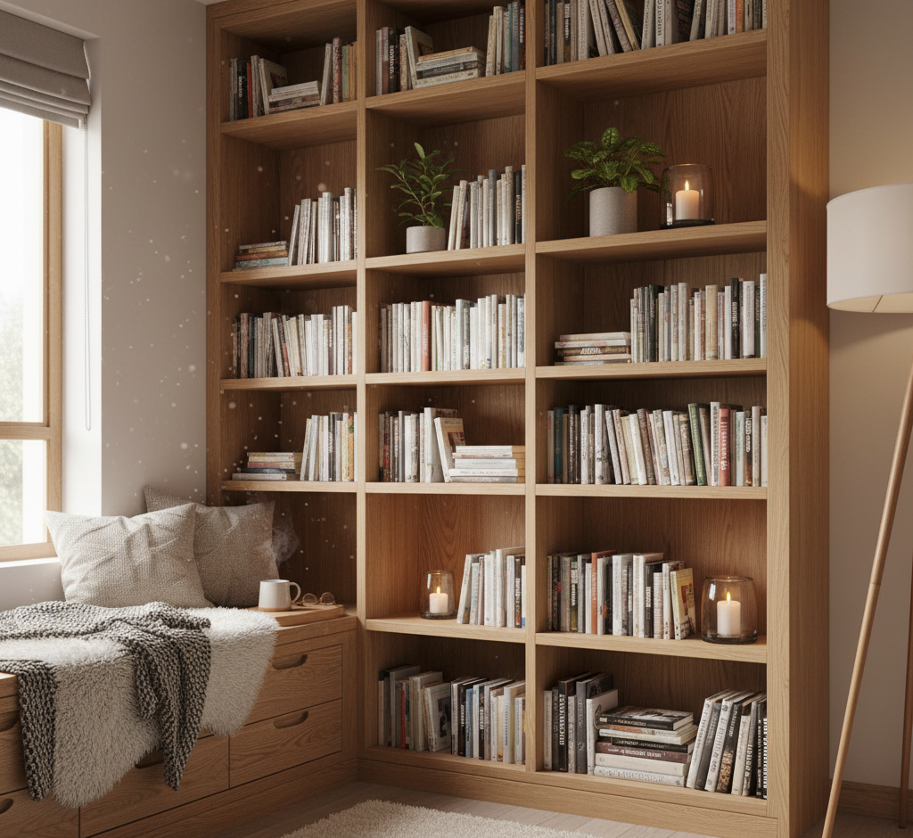 - Estanterías abiertas para libros y velas
