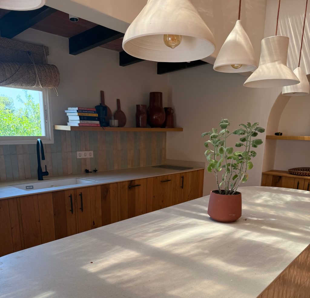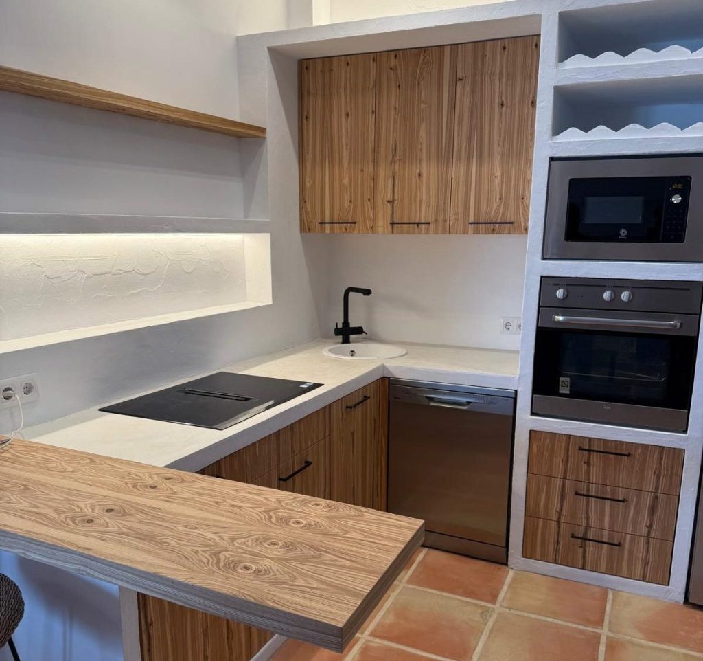 - Cocina totalmente personalizada, fabricada en madera maciza de roble, una de las especies más nobles, resistentes y duraderas del mercado. Su diseño combina armarios, estanterías abiertas y puertas con acabados naturales, aportando calidez al espacio.