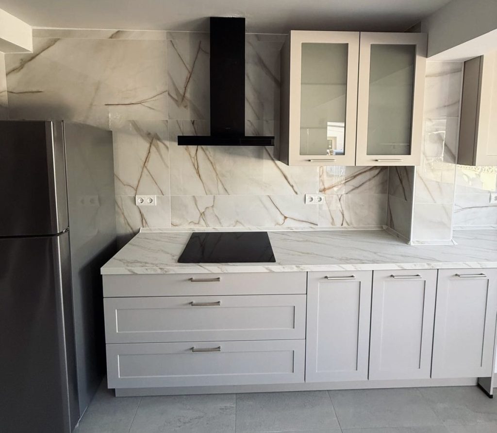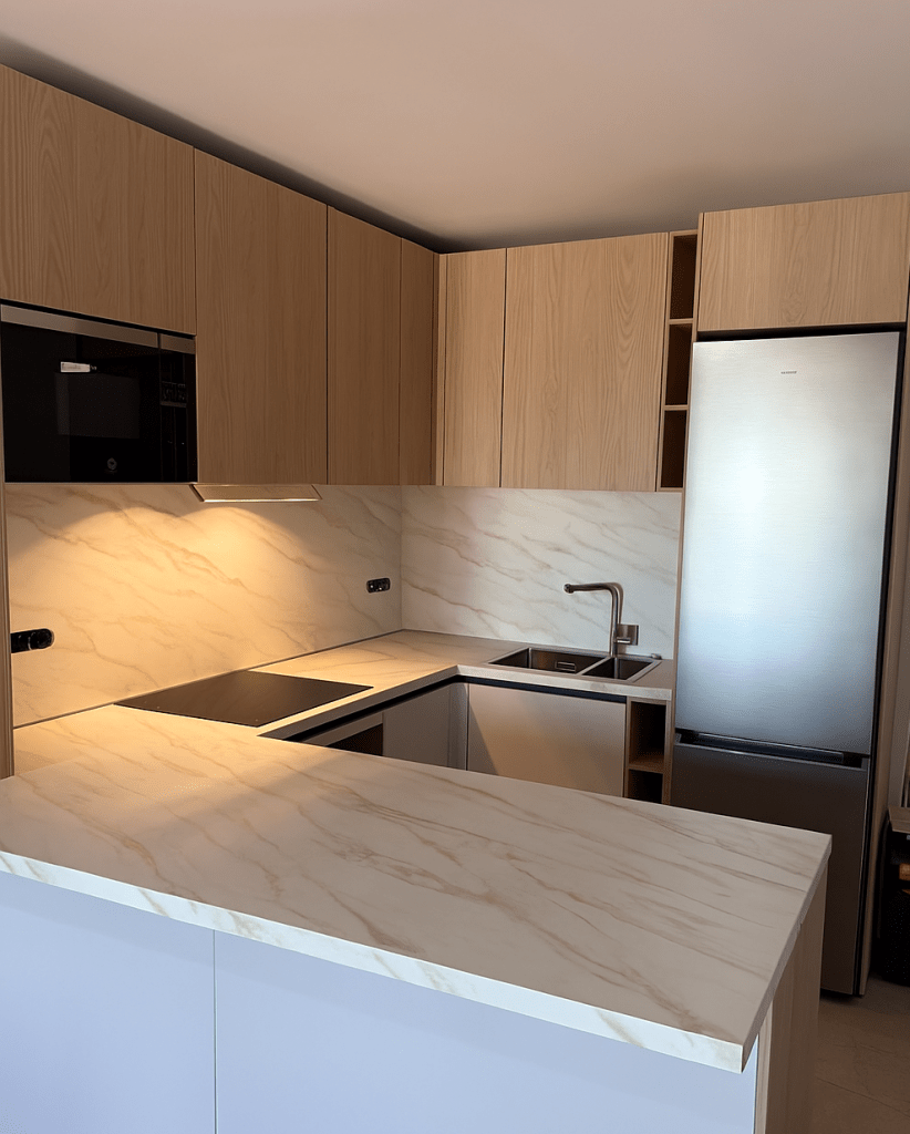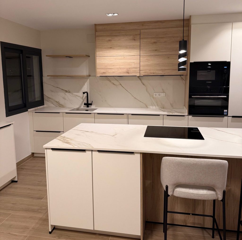 - La encimera, de aglomerado con un refinado efecto mármol, añade un toque de sofisticación y continuidad visual, extendiéndose también al frente de la pared para reforzar la armonía del conjunto.
